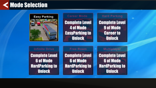 2、完成【EasyParking】关卡,攒金币升级巴士,后续解锁【Hard Parking】等【练Free Roam】熟悉操作,挑战Multiplayer联机停车,提升技巧。
