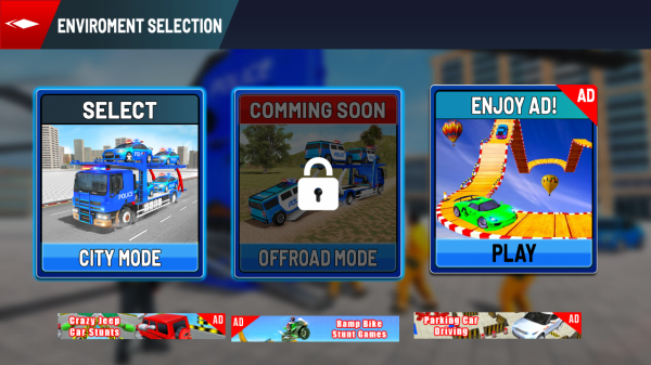 1、主界面点【PLAY】,选【CITY MODE】(城市模式),解锁基础运输任务,确认后驾驶蓝色警车,进城市赛道。