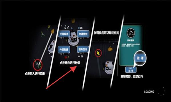 2、新手引导:按提示,点击炮台升级(如“点击炮台进行升级”),提升攻击、射速等,强化防御,应对丧尸。