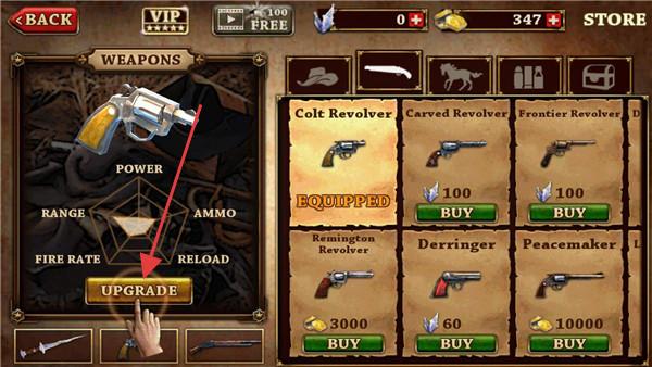 2、武器界面,选左轮手枪(如Colt Revolver),点击【UPGRADE】升级,提升火力、射速等属性,强化战力。