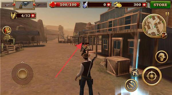 3、战斗中,操控牛仔,用虚拟摇杆移动,瞄准箭头指向的敌人(如小镇枪手),射击击败,推进西部关卡。