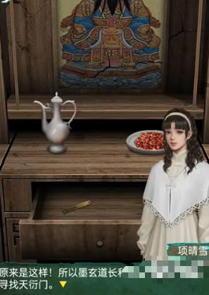 茶馆与雕像:来到茶馆点击查看桌子上的书,点击雕像,根据书上的线索和日晷处的线索日月相合,调整雕像的手势左手-日君诀、右手-月君诀,打开底座,获得日晷残片。