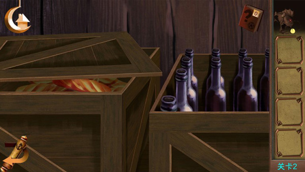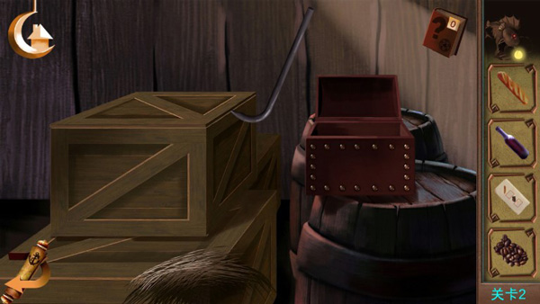 2、开“酒瓶箱”!用撬棍开右边木箱,拿到“紫酒瓶”,收集物品后,记好位置(法棍、酒瓶),后面组合或用在场景。