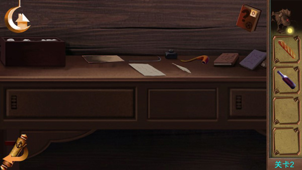 3、搜“书桌”!点桌上纸条、羽毛笔,触发线索,把法棍、酒瓶放道具栏,等遇到“喂食、浇灌”机关,对应使用。