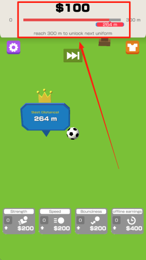 1、玩家需要控制足球的发球点和力度,点击蓄力以达到最佳的射门效果,将足球踢得更远,赢得更多的分数与奖励。