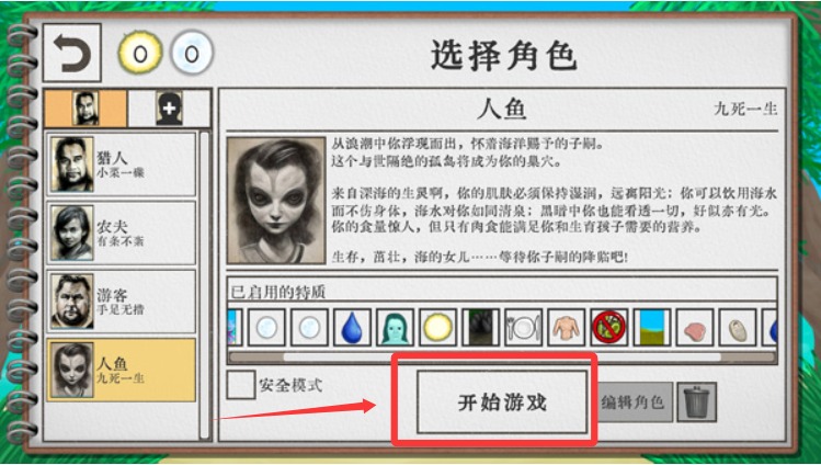 3、开始选择你的角色,拥有猎人、农夫、游客、人鱼等等角色可以选择,每个角色都拥有不同的特质,选择好后点击开始游戏。