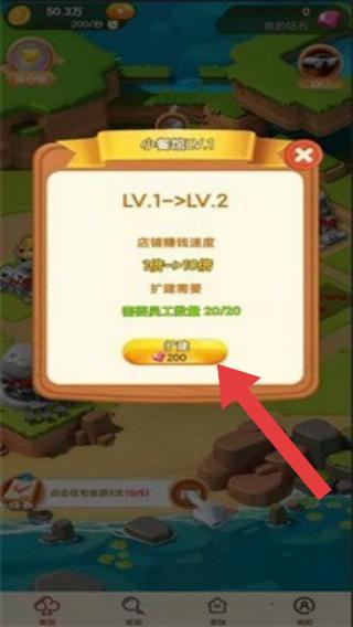 2、显示“小餐馆达人”从LV.1升级到LV.2的信息,包含店铺赚钱速度提升、扩建需要,以及消耗200钻石的升级按钮,体现经营建筑升级的玩法。