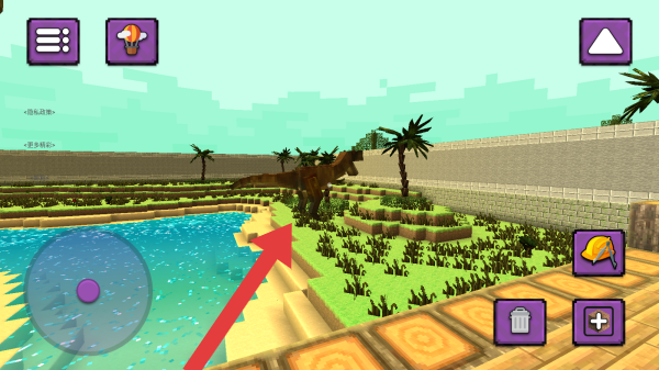 3、呈现像素风格的开放场景,有恐龙、水体、植被等元素,界面有功能按钮,属于创意或冒险玩法中自定义地图(含恐龙元素)的探索场景。
