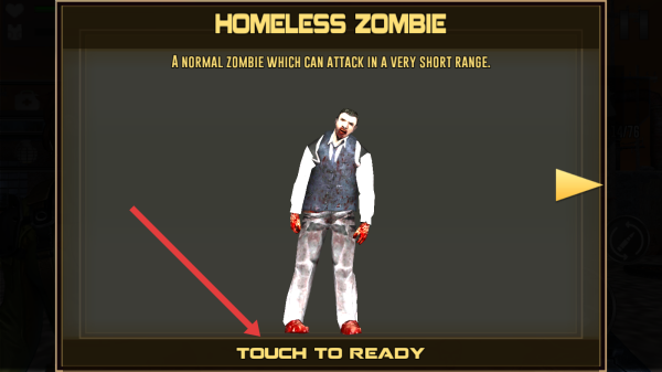 2、选“HOMELESS-ZOMBIE”,点【TOUCH-TO-READY】,确认兵种,进入实战,熟悉短程攻击特性。