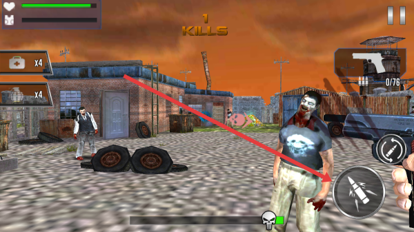 3、战斗中,用火箭筒(箭头指向)攻击,注意血包(×4)补给,在废土场景,清理丧尸,提升KILLS。