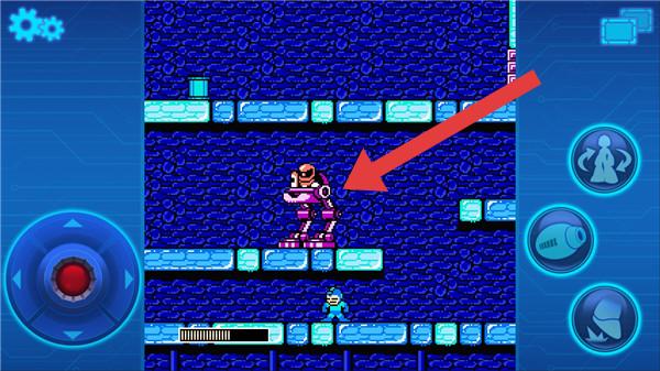 3、遇到紫色机械敌人(箭头指向),调整摇杆,移动洛克人,用右侧技能(如射击)攻击,推进流程。