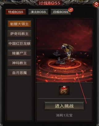 2、挑战不同BOSS,消耗元宝进入,击败后获取更强力装备道具。