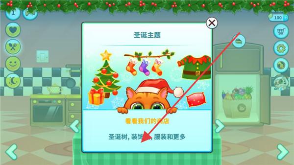 3、点右侧购物车!优先买圣诞帽,给猫戴上,魅力值+50,再买圣诞树放客厅,触发节日剧情,领钻石,下次商店刷新买新衣服。