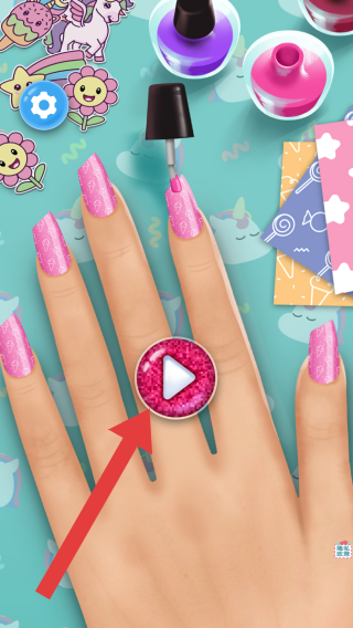 1、呈现美甲制作场景,有美甲工具(指甲油等)、美甲完成的手部效果,属于模拟经营美甲店,进行美甲设计制作的环节。