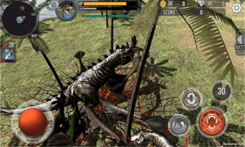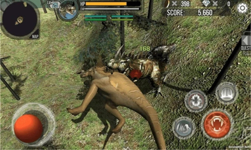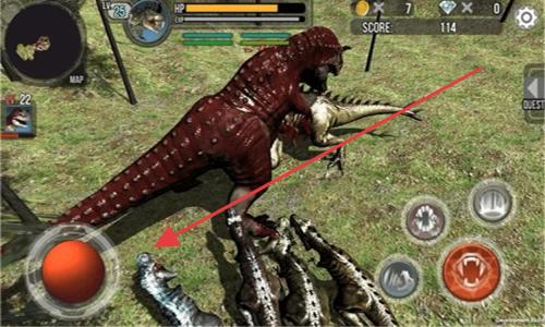 1、选红暴龙开局!见小恐龙直接咬,血条下得快就换目标,别硬刚大恐龙,屏幕左摇杆控制移动。