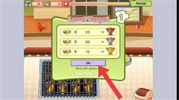 2、呈现的是关卡目标界面(LevelTarget),显示第1关,需达成制作25、50、75份食物的目标,有【OK】确认按钮,属于模拟经营烤肉店的关卡设定环节。