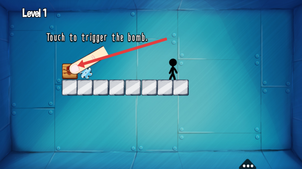 2、在Level1,点击箭头指向炸弹,触发爆炸,清除障碍(齿轮),帮助火柴人通过,推进关卡。