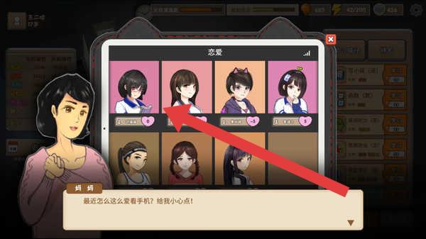 3、进入恋爱界面,选箭头指向角色(如第一排左二),触发恋爱事件,完成妈妈对话,提升亲密度。