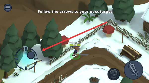 2、按箭头指引,在雪地场景移动,寻找目标(Next-target),避开障碍(树木),推进任务流程。