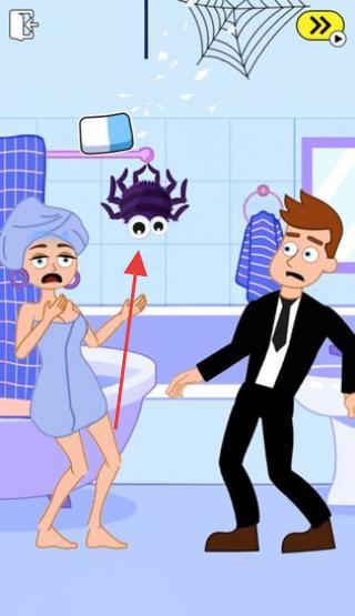 2、进入浴室场景,关注巨大蜘蛛,通过点击或拖拽等操作,处理蜘蛛,安抚受惊角色,完成该场景的解谜任务。