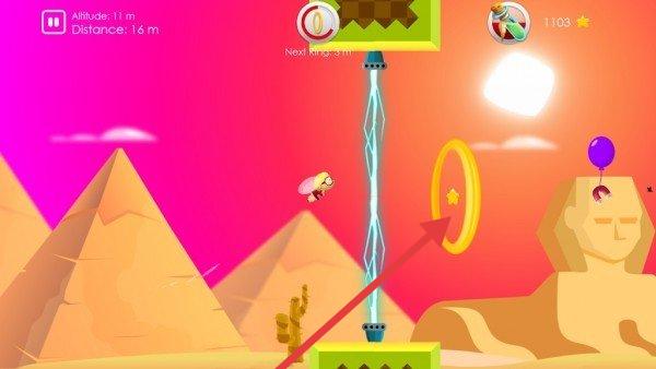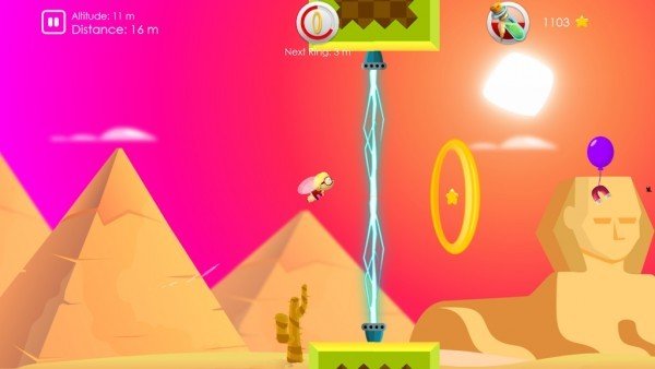 3、驾驶飞行角色穿梭于金字塔间,瞄准金色圆环飞行,借助闪电柱等特殊场景元素,调整飞行节奏,穿越障碍,持续推进飞行冒险,刷新飞行成绩。