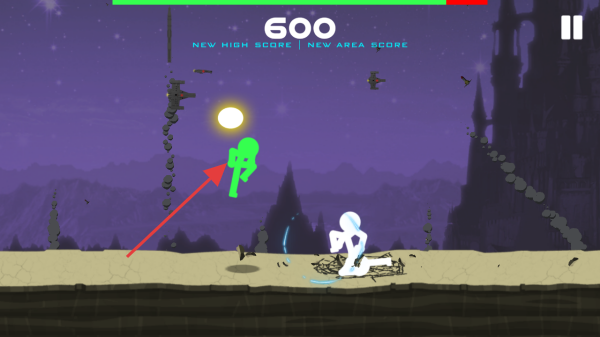 2、游戏中,操控火柴人在地形上奔跑,遇到障碍(如石块、敌人)时,利用速度优势,通过点击或滑动操作,触发闪避、攻击,积累分数。