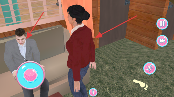 2、进入室内场景后,关注场景中的人物(如沙发上的男性、站立的女性),通过点击或互动按键,与他们交流、互动,推进家庭生活相关任务。