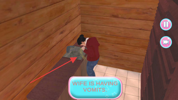 3、当出现【WIFE IS HAVING VOMITS】提示时,操控孕妇角色前往对应位置,完成呕吐模拟动作,按指引体验孕期生理反应,推进剧情流程。