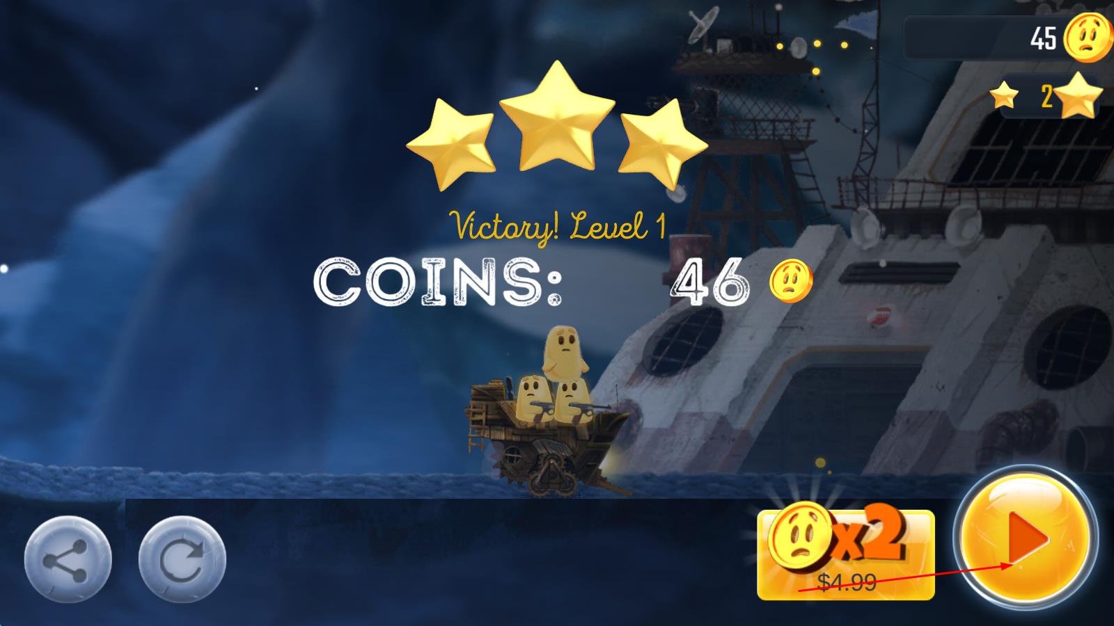 2、游戏中途,利用金币钻石升级武器装备,驾驶汽车载具突破敌人封锁,在闯关过程中留意隐藏角落,拯救被困的小黄人同伴。