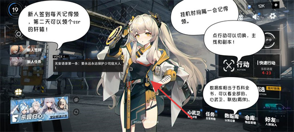 1、新人签到记得打卡,第二天可以领个ssr的轩辕,新人任务,日常考勤,完成就可以领奖励,挂机时间满了会暂停的,注意别忘了领。