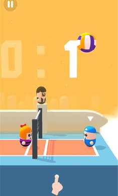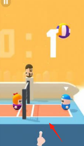 2、操作机制点击屏幕(手指图标),控制角色移动、跳跃,击打排球(彩色球),争取得分(比分1:1→变化)。