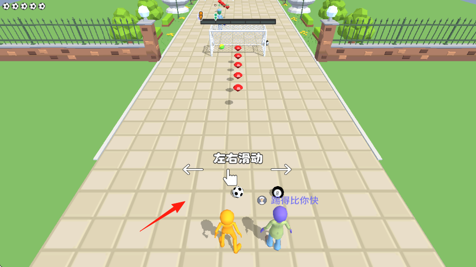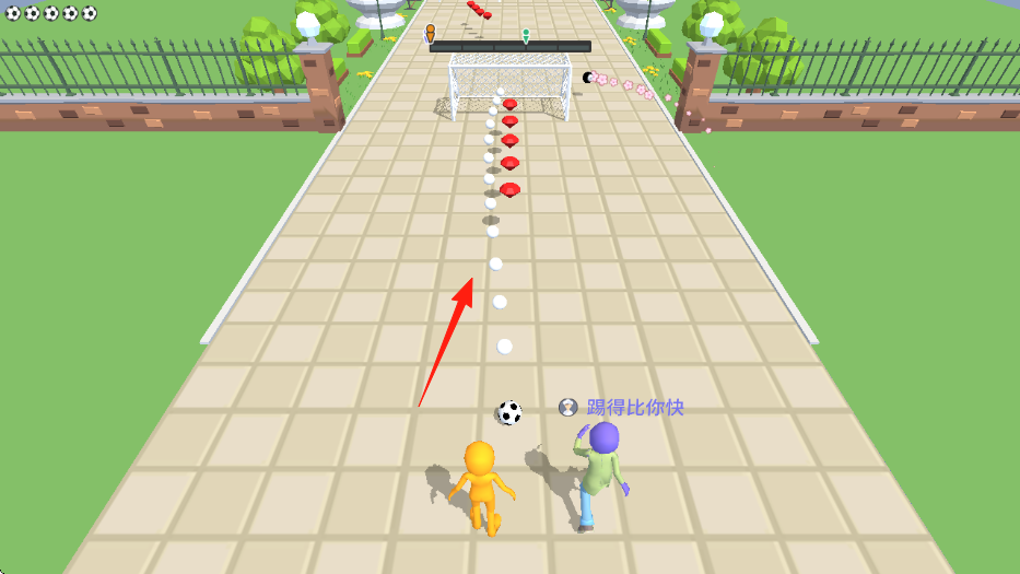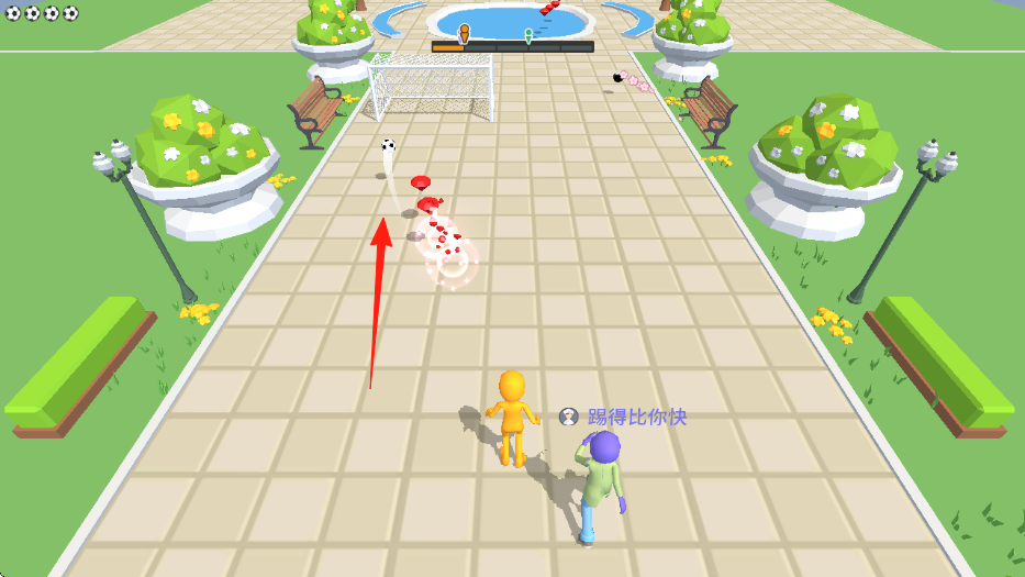 3、场景推进从直道→带水池花坛的公园场景,跨越不同地形,率先将球踢入球门,完成关卡。