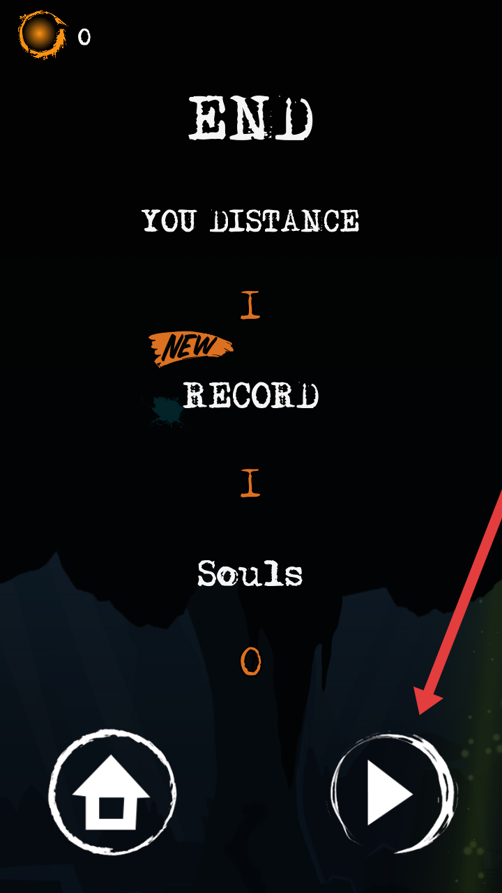 3、游戏结束后,可点击右侧箭头按钮重新挑战,或点击左侧房屋图标返回主界面,查看本次距离与灵魂数记录。
