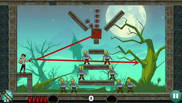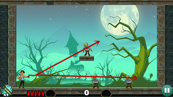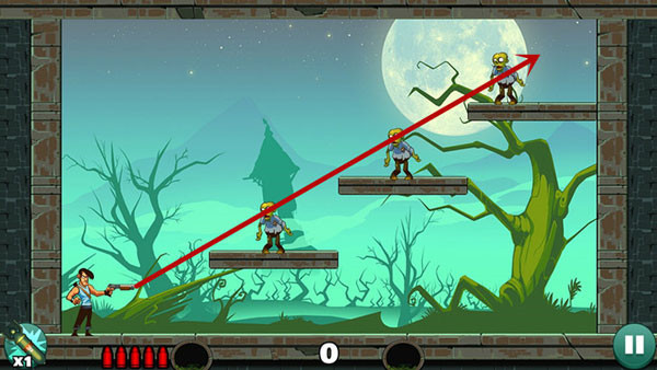 1、这关过起来最容易,没什么技巧,直接瞄准僵尸射击即可,如果想一发子弹过关不妨多试试不同的角度。
