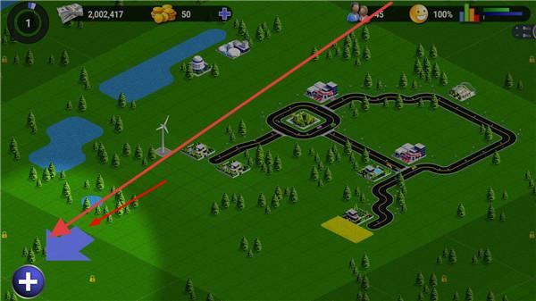 2、点“+”扩地!蓝色箭头处是可扩张区域,花金币买,每块地+5格,扩地前存够钱,优先扩住宅区。