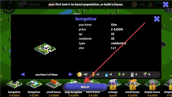 3、建“bungalow”点BUILD!选已有2个的住宅,点建造,2秒完成,每建1个,人口+10,完成任务领奖励。