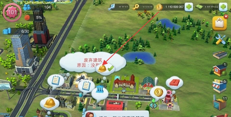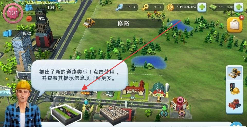 1、点“新道路”提示!3秒内点,解锁高级道路,提升城市美观,居民满意度+10%,修在商业区旁。