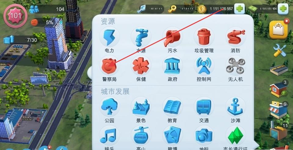2、开“资源”选“污水”!先建污水处理厂,解决污染,城市健康值+15,每升1级建1个,别让污水超标。
