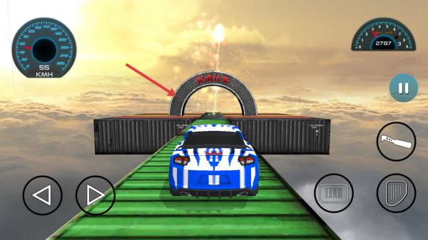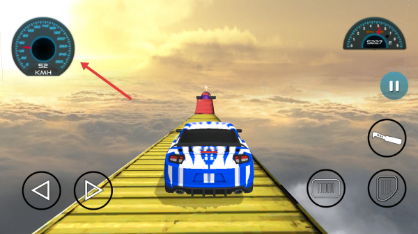2、行驶中关注左侧速度表,通过虚拟按键控制车速,保持平衡飞越障碍。