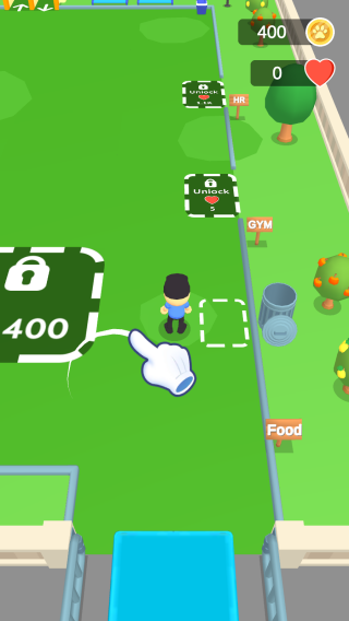1、显示“400”“GYM”“Food”等标识,还有带锁需解锁的区域,以及金币、爱心等资源,角色有操作指引(手指图标),呈现解锁新区域、规划建造的玩法环节。