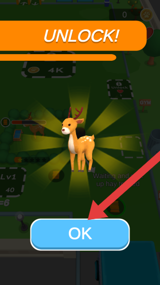 2、显示“UNLOCK!”提示,解锁出一只小鹿,有“OK”确认按钮,背景可见“GYM”等标识,属于解锁新内容(小鹿)的环节。