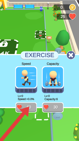 3、“EXERCISE”模块,包含“Speed”“Capacity”两种属性提升选项,分别显示等级、属性加成及升级所需爱心,用于体现角色锻炼属性养成的玩法环节。