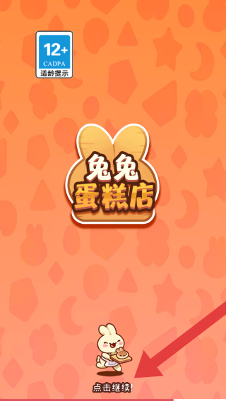 1、显示游戏名称:兔兔蛋糕店,12+,CADPA适龄提示,根据提示点击【点击继续】方可进入。