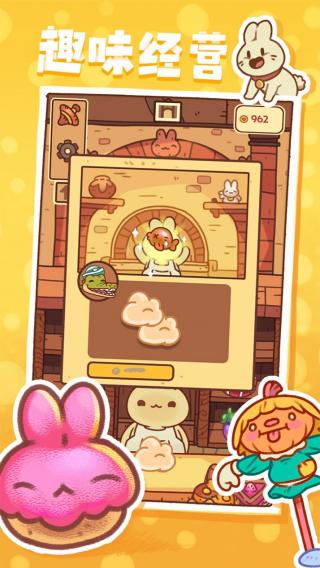 1、萌系画风设计:采用超萌的卡通画风,毛茸茸的兔子角色、造型精致的蛋糕甜点与温馨的店铺场景相映成趣,营造治愈人心的体验。