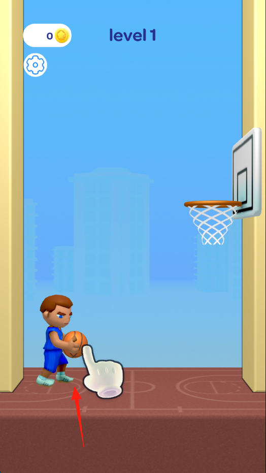 2、关卡推进从“level1→level2”,成功进球(入筐),收集金币(0→1),解锁新关卡。