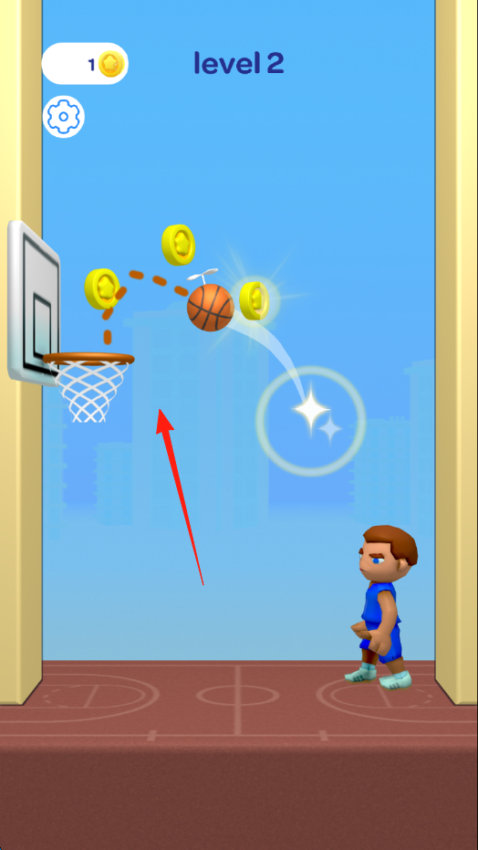 3、道具互动投篮时可触发特效(星星、金币),利用场景(城市背景),调整力度、角度,完成高难度进球。
