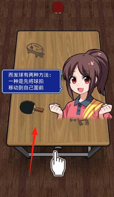 1、教学模式卡通角色讲解发球,如“先将球拍移动到自己面前”,在乒乓球桌场景教学基础操作。