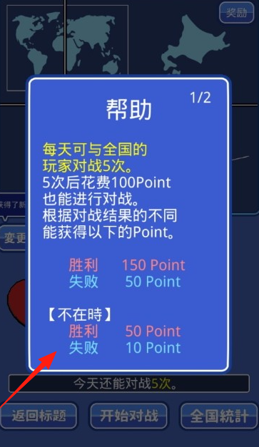 3、对战规则每日可对5次,5次后需100Point继续,胜利失败获不同积分(胜利150不在时胜利50等),可全国对战。