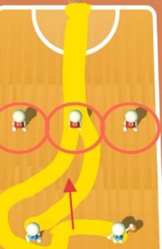 1、路径规划在篮球场地,用黄色线条规划运球路线,避开红色圈(防守角色),引导持球角色突破。