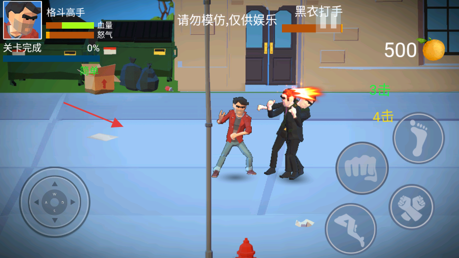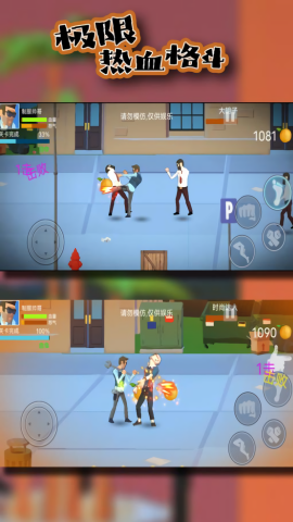 2、操控角色在街头移动,点击技能按键,攻击黑衣打手,完成关卡挑战。